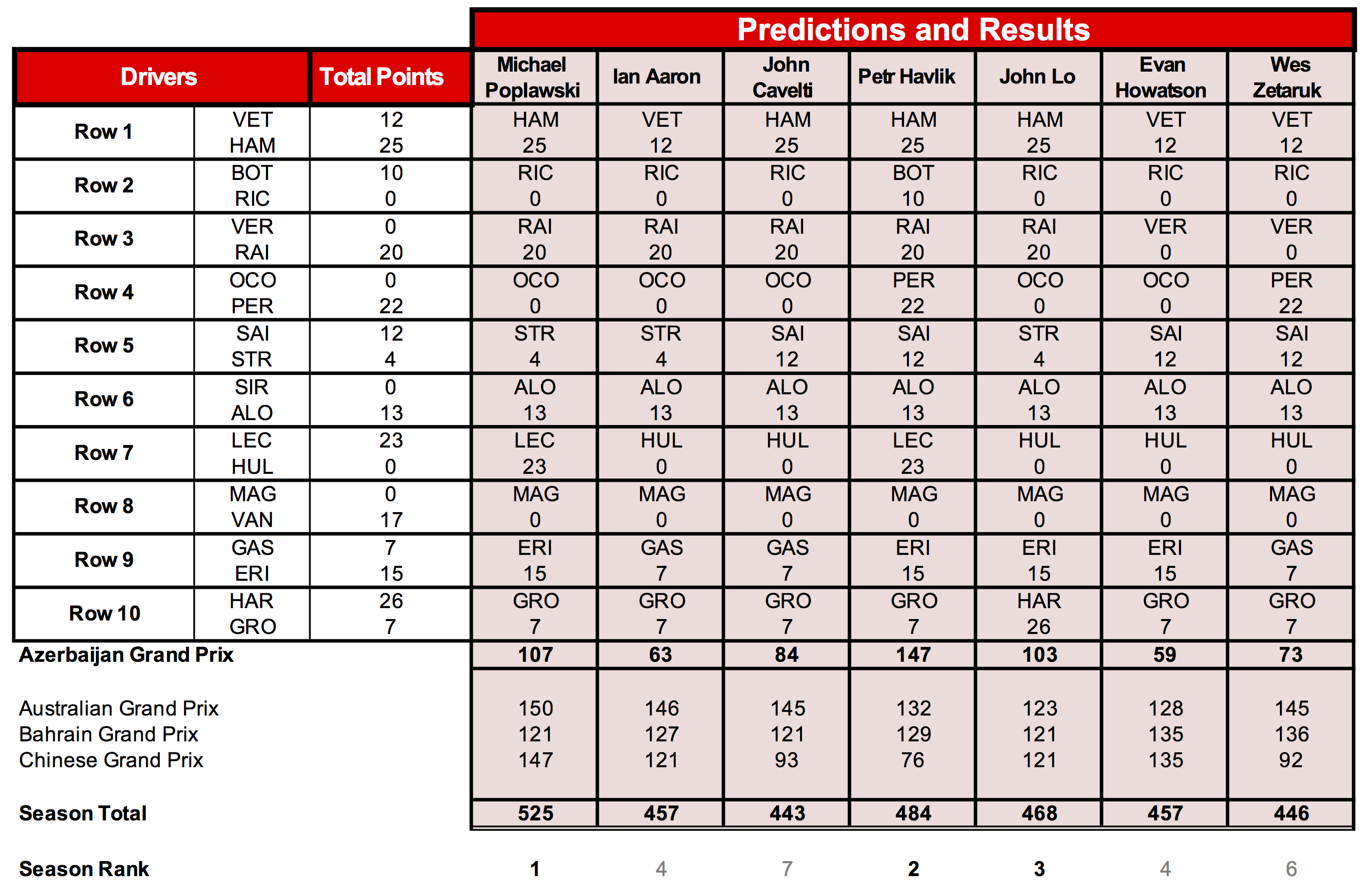 Petr was the big mover this round, picking the better driver in eight of the 10 rows, helping to scored 40 points over the nearest rival on the day to move into second place overall. Michael and John Lo were next best on the day and hold first and third for the season.