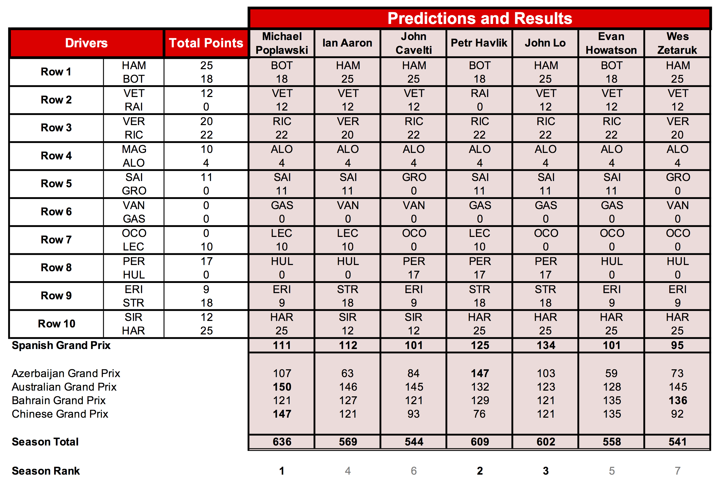 John Lo was our top player this round, picking the better-scoring driver in seven of the nine rows where drivers scored points, and building a bigger cushion in third place overall. Petr was second on the day, helping him move 14 points closer to overall leader Michael.