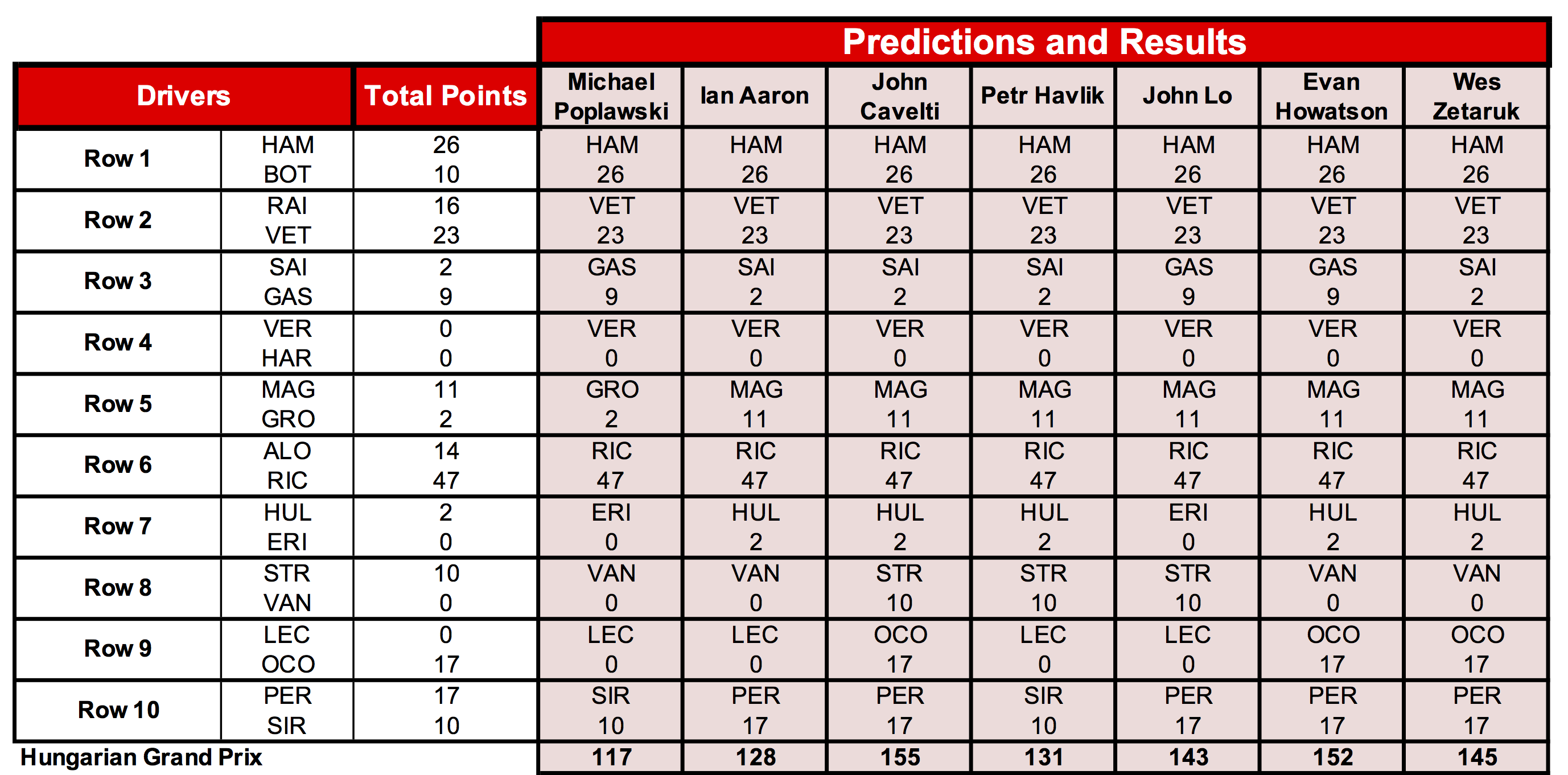 Our game has a new leader as Evan selected the best driver in eight of the nine point-scoring rows. John Cavelti was the best player on the day, moving him into second place overall while Michael drops to third from first.