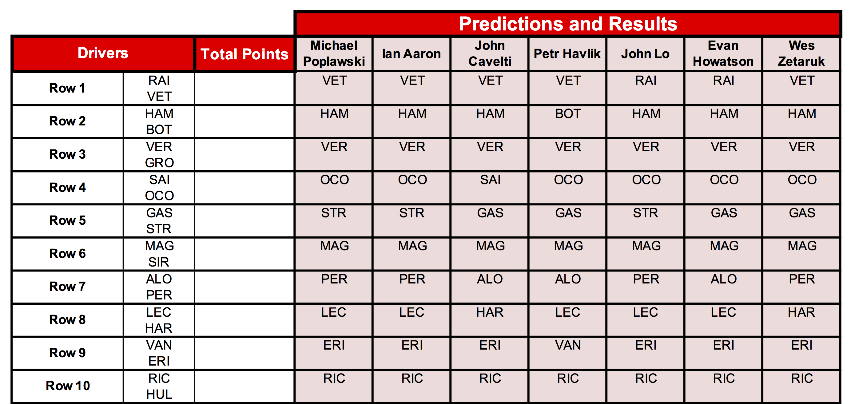 Kevin Magnussen (over Sergey Sirotkin) and Daniel Ricciardo (over Nico Hülkenberg) have locked out their rows for tomorrow’s race in our estimation, while all other drivers have at least one player picking them to earn the most points in their row. We’re most split on how Lance Stroll will fare against Pierre Gasly and how Sergio Pérez will do against Fernando Alonso.