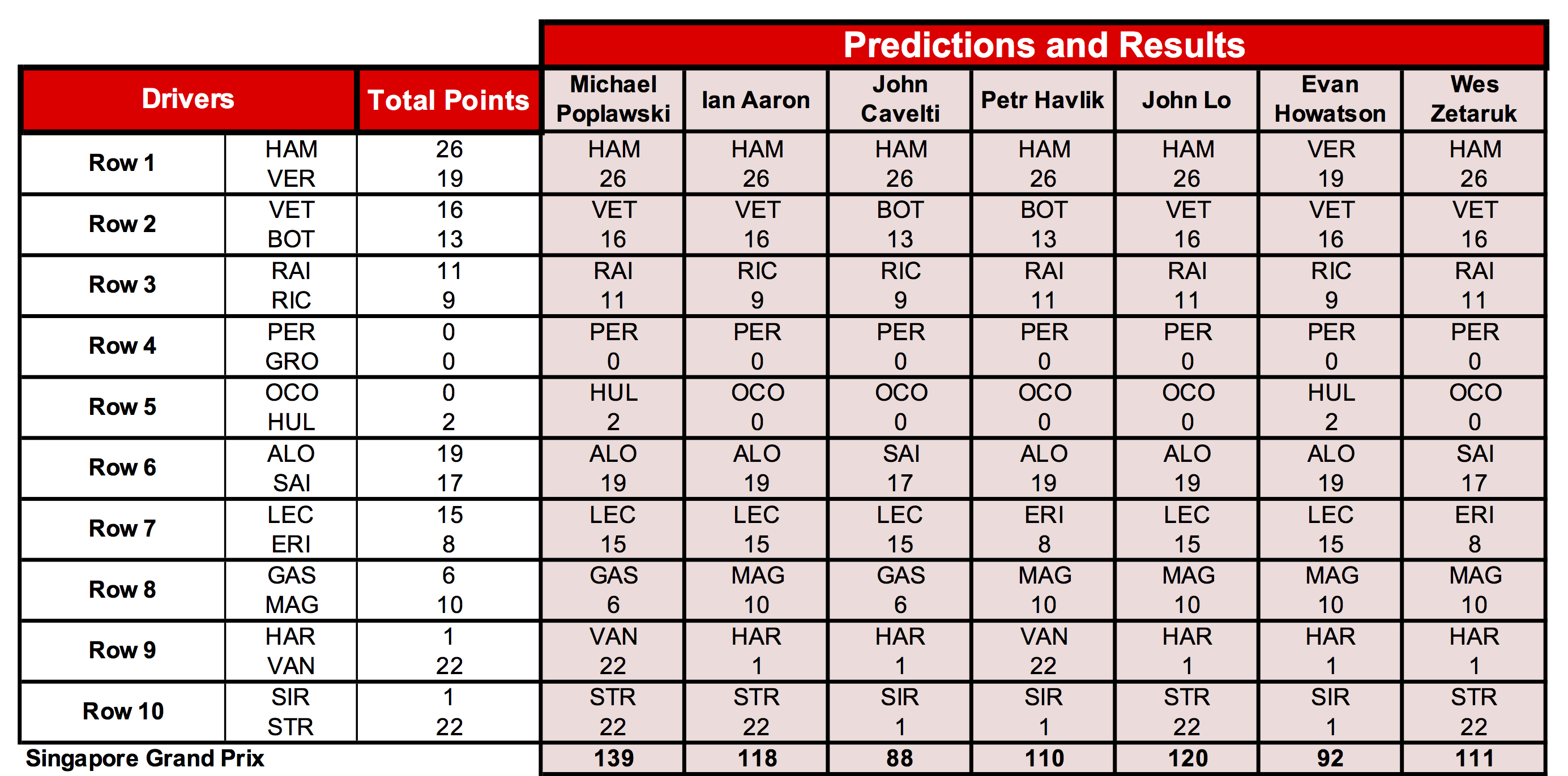 Michael increased his lead at the top of our game by predicting the better-scoring driver in nine of the ten rows, including being the only player to predict the high-scoring ninth and tenth rows correctly. Best of the rest of us were John Lo and Ian, who, along with Wes, are threatening John Cavelti in third place. Only seven points separate the third (and last prize spot) and sixth place in our game.