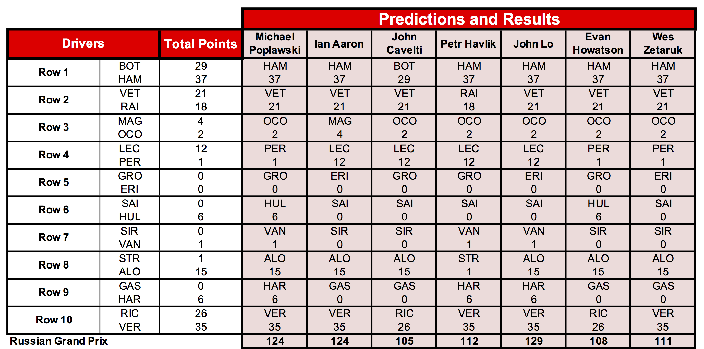 John Lo’s predicting the better-scoring driver in eight of the nine scoring rows has moved him into third place, only six points behind Evan, but only four points ahead of Ian, who sits just outside of the prize money placings in fourth place. Michael increased his lead, while only 23 points separate second and sixth place.