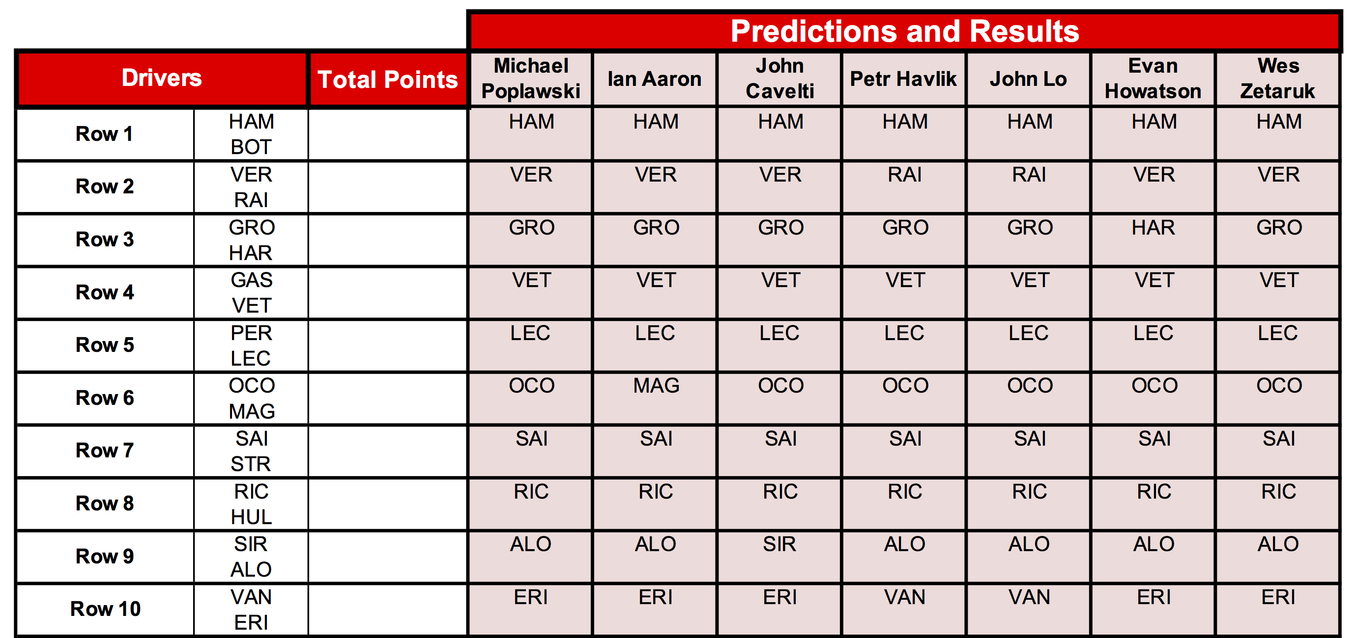 Our predictions definitely play to a pattern, with five rows being selected unanimously (Valtteri Bottas, Pierre Gasly, Sergio Pérez, Lance Stroll and Nico Hülkenberg will all have something to prove to us). The five rows which where a handful of us have gone with some outliers may prove to be crucial in our game as so few points separate most of us.