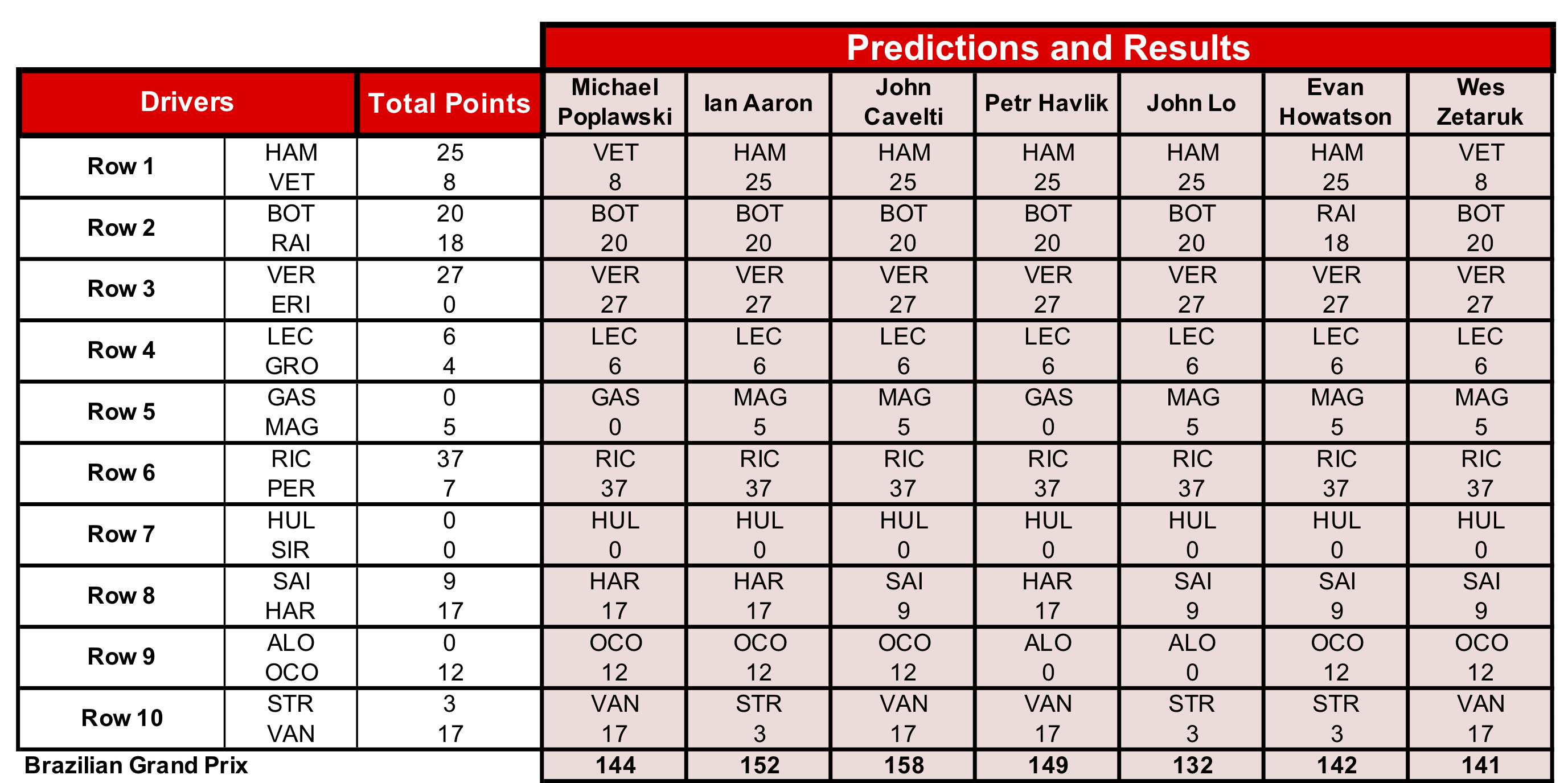 John Cavelti was our top scorer this week, having the better-scoring driver in eight of the nine scoring row, followed by Ian. Ian has now moved into second place overall, while John has reduced his gap to the three prize spots to 22 points entering the final race in Abu Dhabi in two weeks’ time.