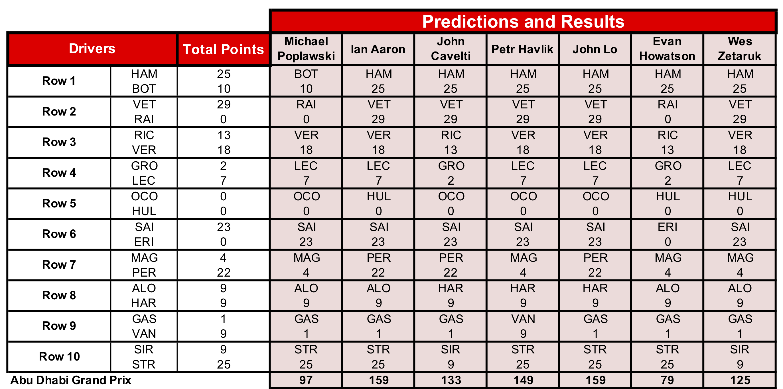 Ian and John finished the season strong in our last race, choosing the better-scoring driver in eight of the nine scoring rows. Ian and John secure second and third place in our game behind Michael, whose lead was large enough to absorb a poor Abu Dhabi score. Congratulations to our podium!