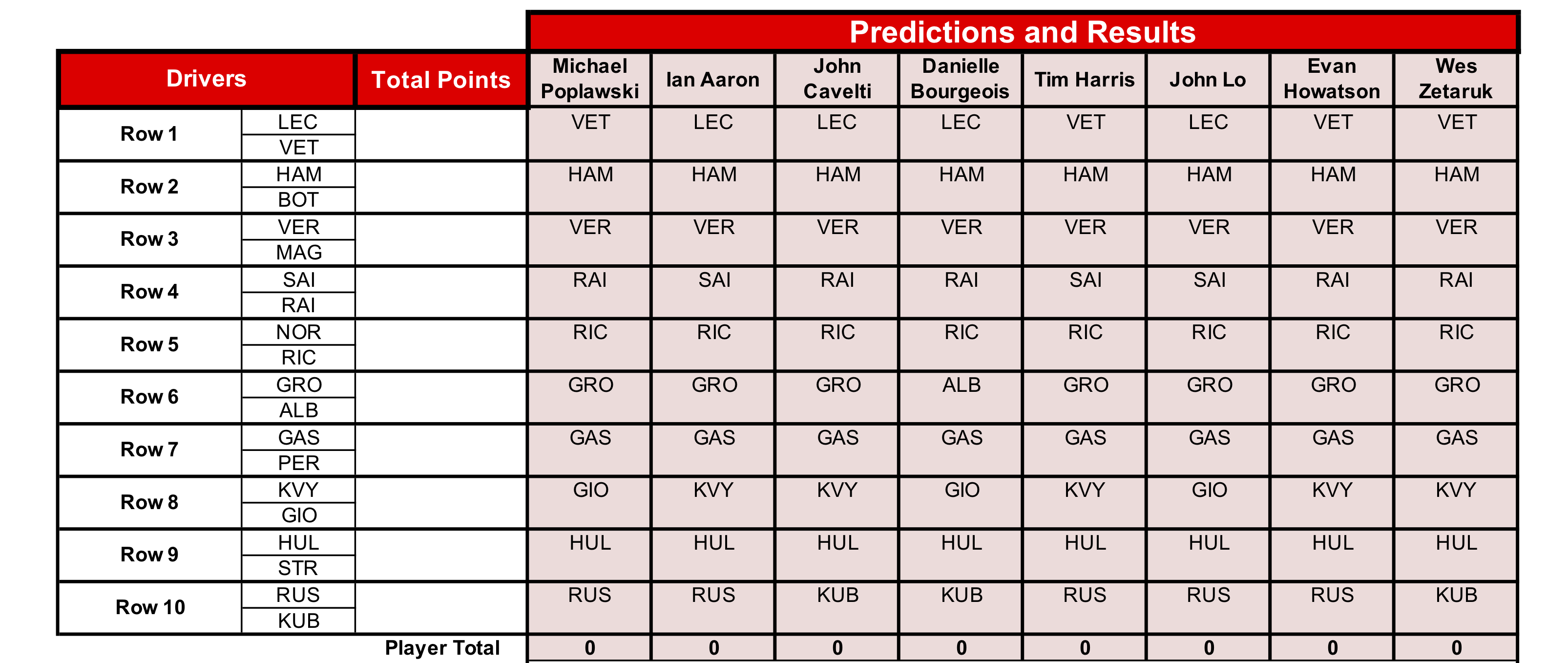 Lewis Hamilton, Max Verstappen, Daniel Ricciardo, Pierre Gasly and Nico Hülkenberg are all unanimous choices to score best in their rows on Sunday, leaving us with five rows to watch, not the least of which being the front row where Charles Leclerc has earned his first ever F1 pole over teammate Sebastian Vettel.