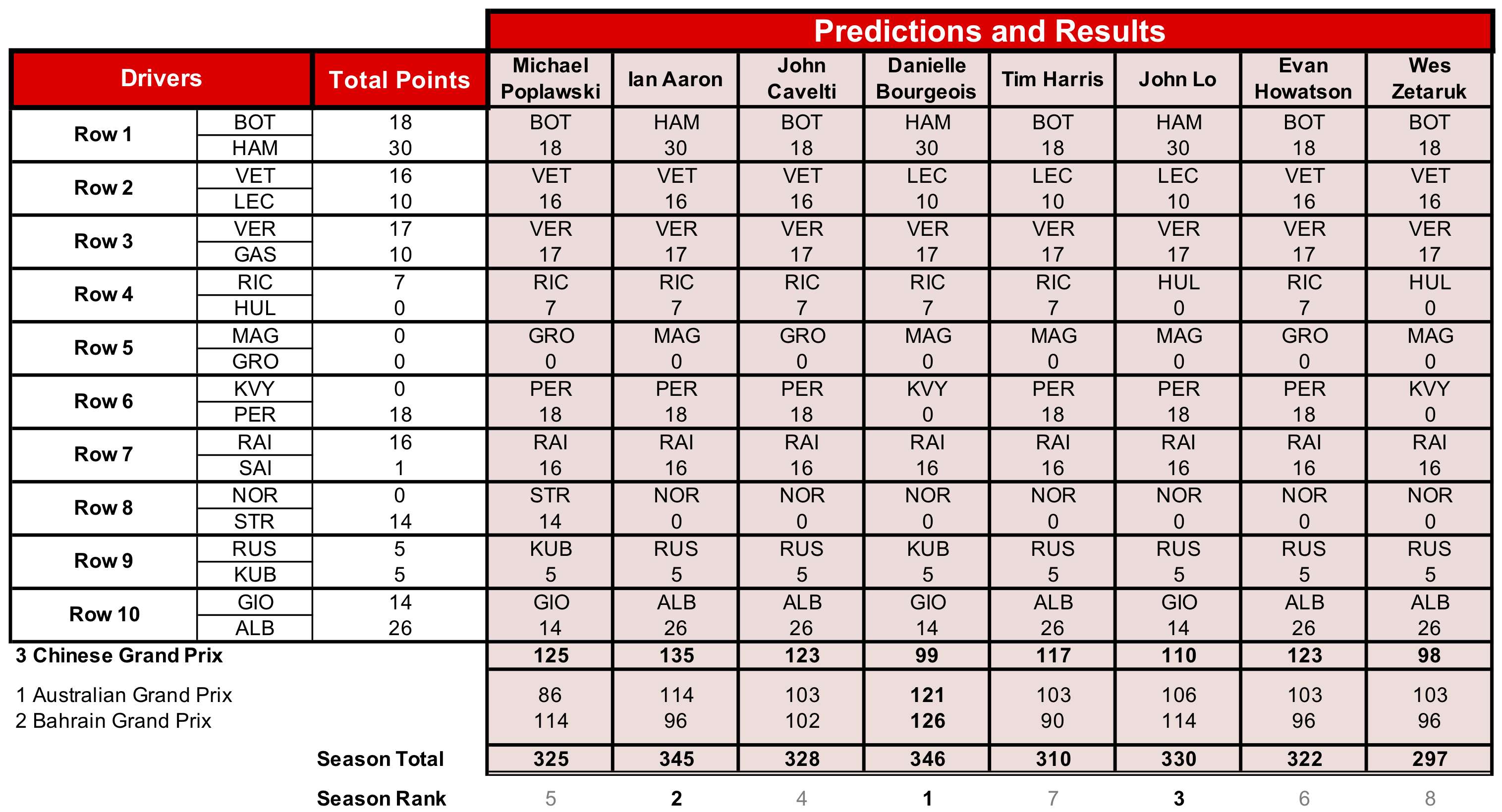 Ian was the big mover this Grand Prix, scoring best points in eight of the nine scoring rows. Danielle maintains her table lead after this third race.