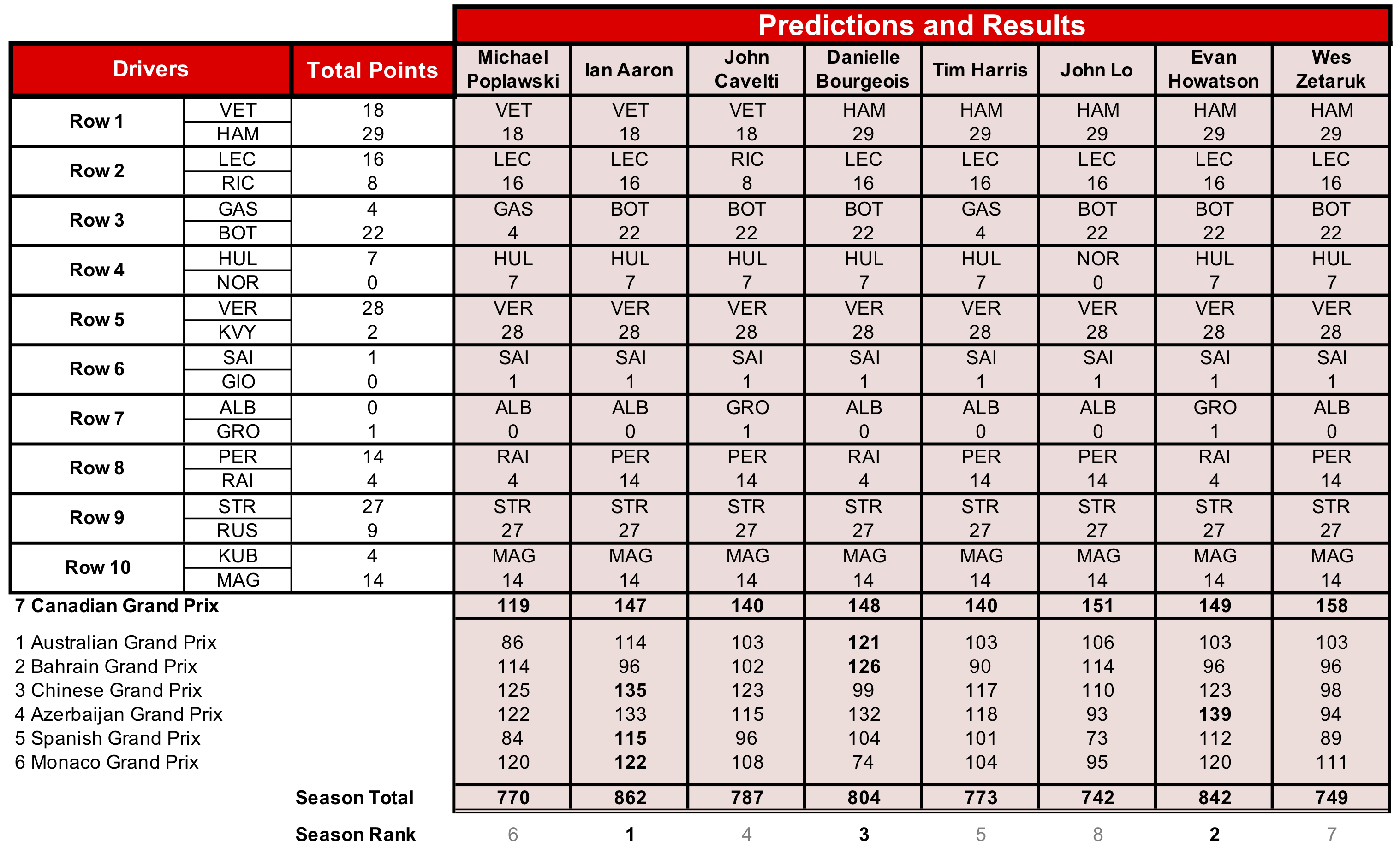 Wes was the biggest mover on the day, missing out on a perfect score by only the 1-point difference between Alexander Albon and Romain Grosjean in Row 7. Solid scores from our three leaders, Ian, Evan, and Danielle, have kept them in that order on the three podium spots.