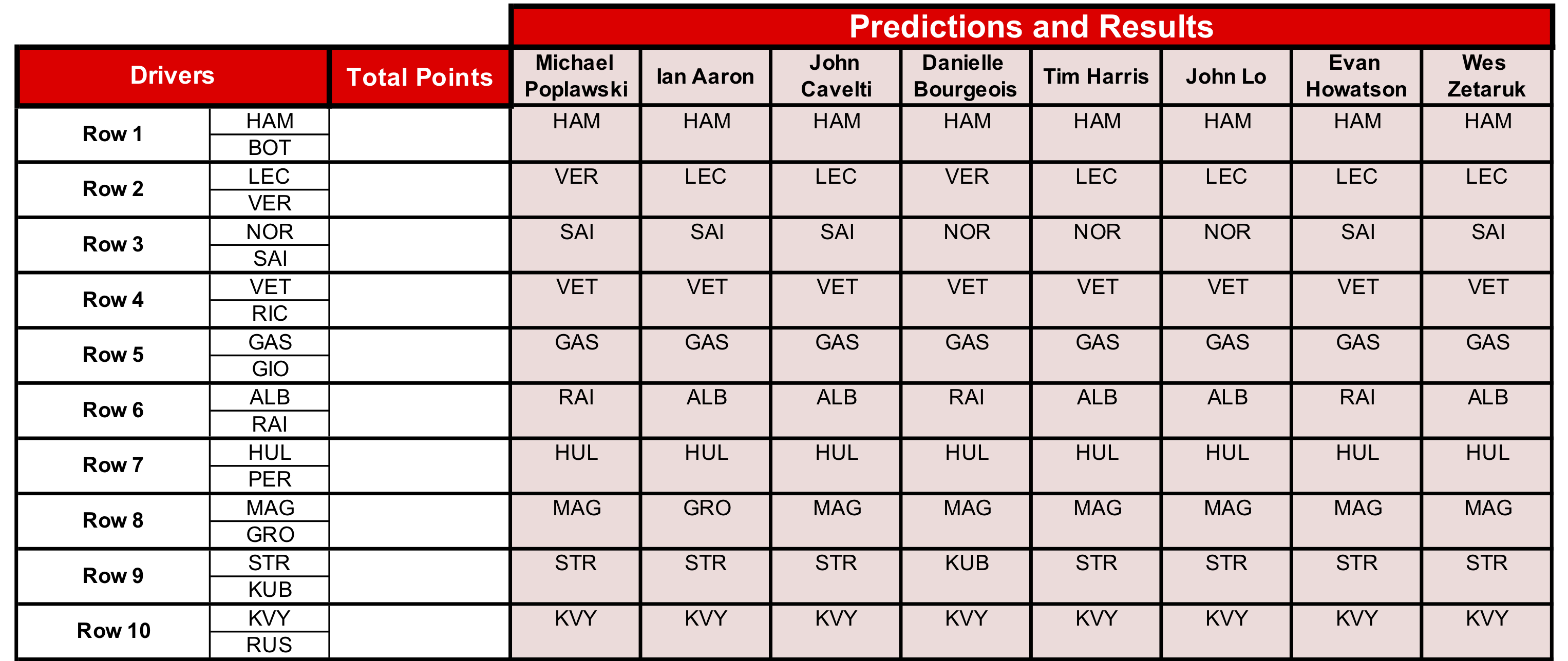 Thankfully, we’re not left without some key rows to watch, primarily Row 3 where Lando Norris and Carlos Sainz, Jr. will battle, and Row 6, where we’re nearly split on Alexander Albon and Kimi Räikkönen.