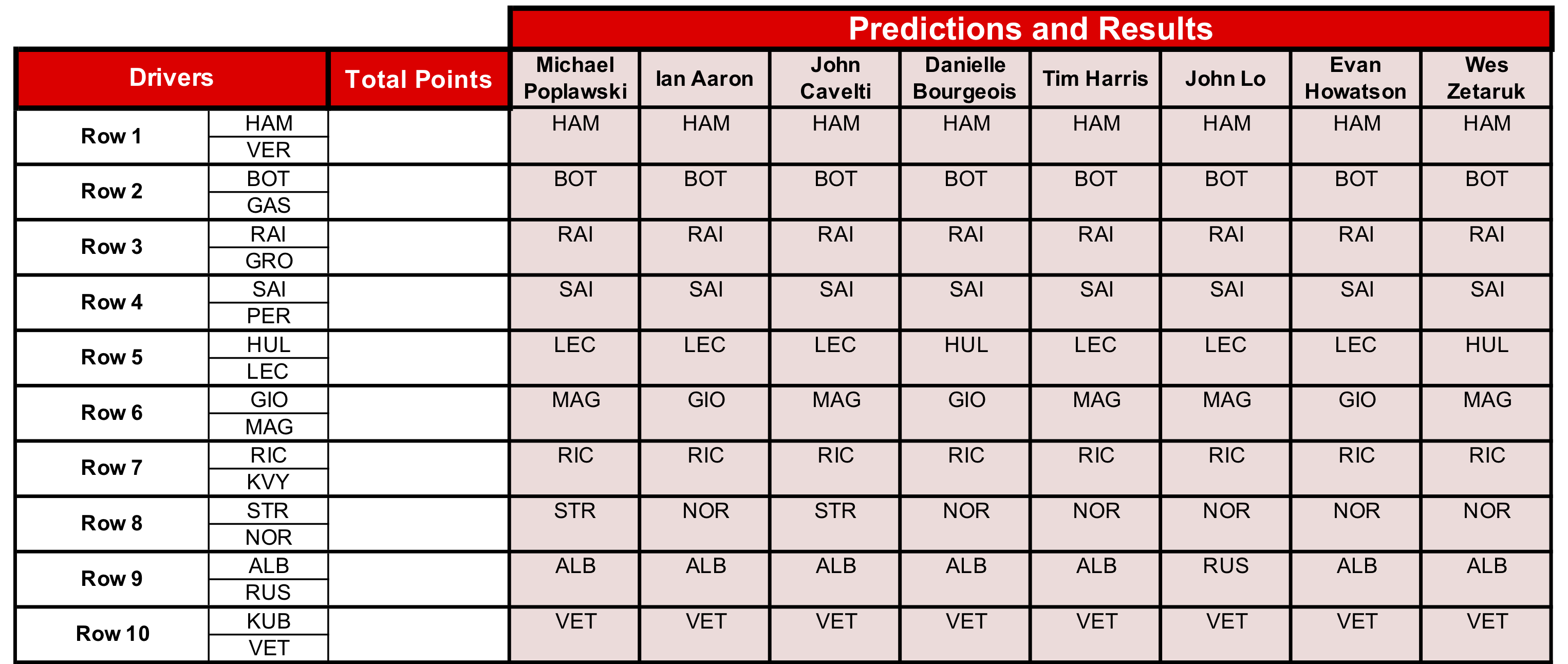 Despite Saturday qualifying that offered a number of surprises and what promises to be an intriguing race Sunday, we found ourselves with a grid with a number of clear choices to follow, leaving only Rows 5, 6, 8 and 9 in play.