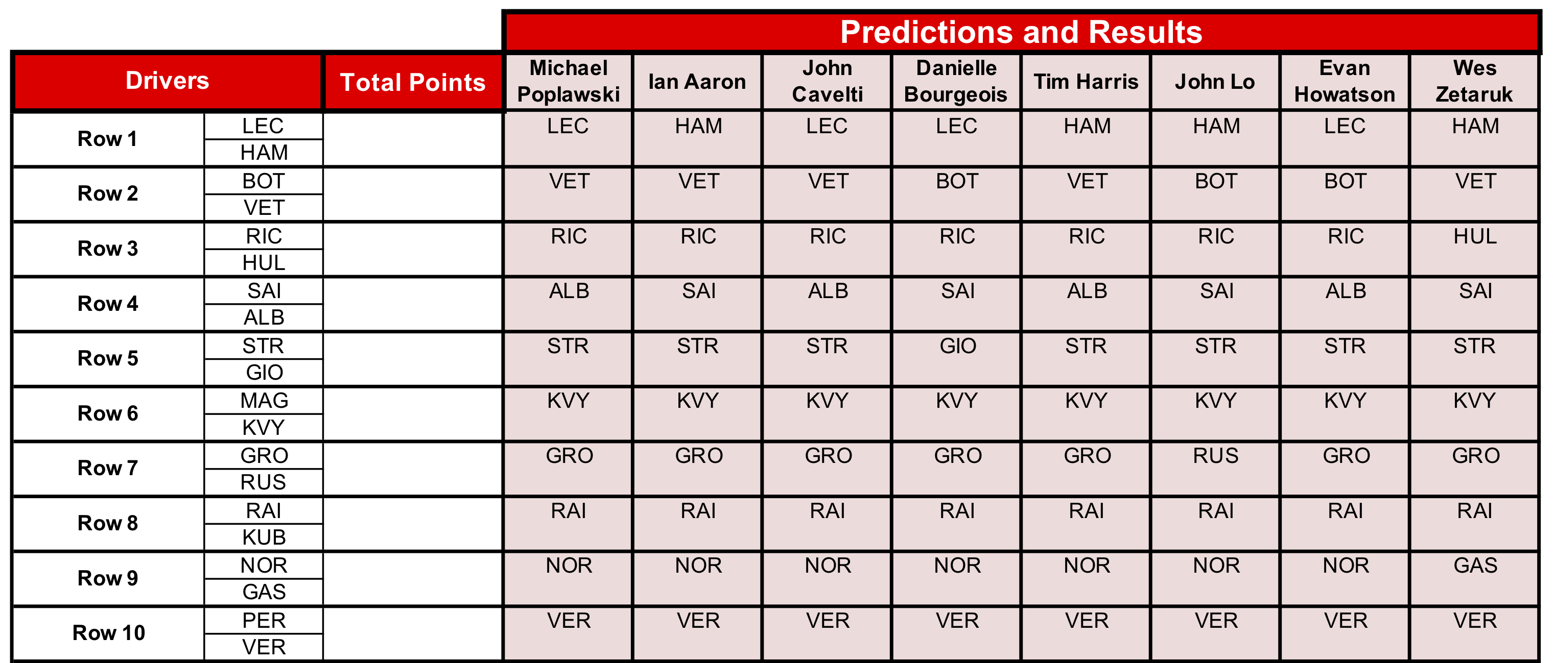 Seven rows are in play, with both Rows 1 and 2 dividing our predictions almost evenly. Only Kevin Magnussen, Robert Kubica and Sergio Peréz didn’t get any support from us for this race.
