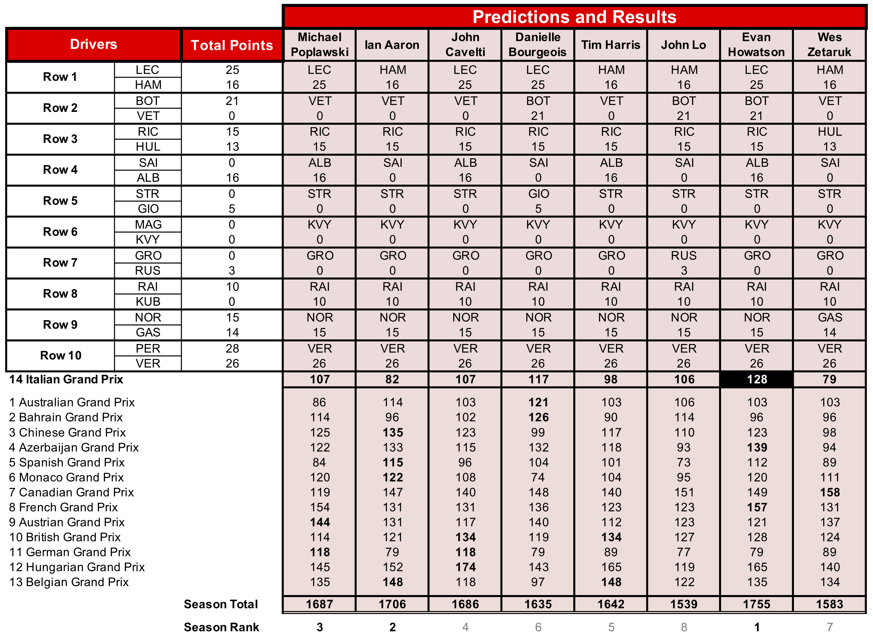 - Charles Leclerc (Ferrari) 25 points; last but not least, the pole-sitter backed up his Spa win with a victory for the tifosi