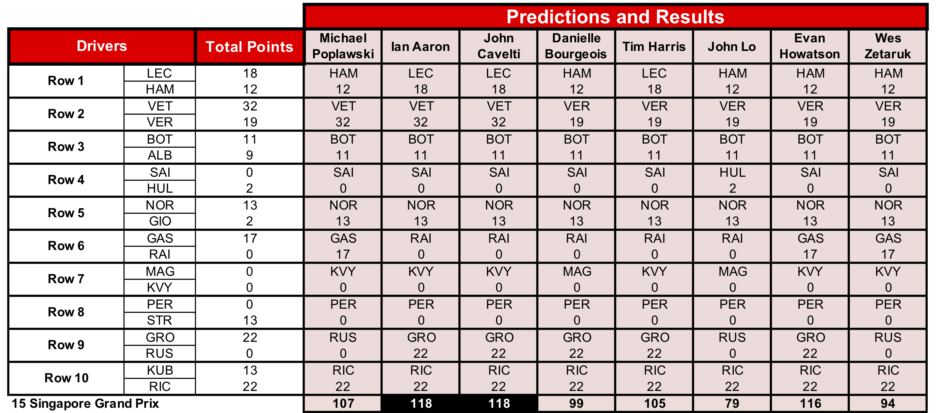 The matching predictions from Ian and John moved them into the second and third place spots behind Evan, who nearly matched their results on the day.