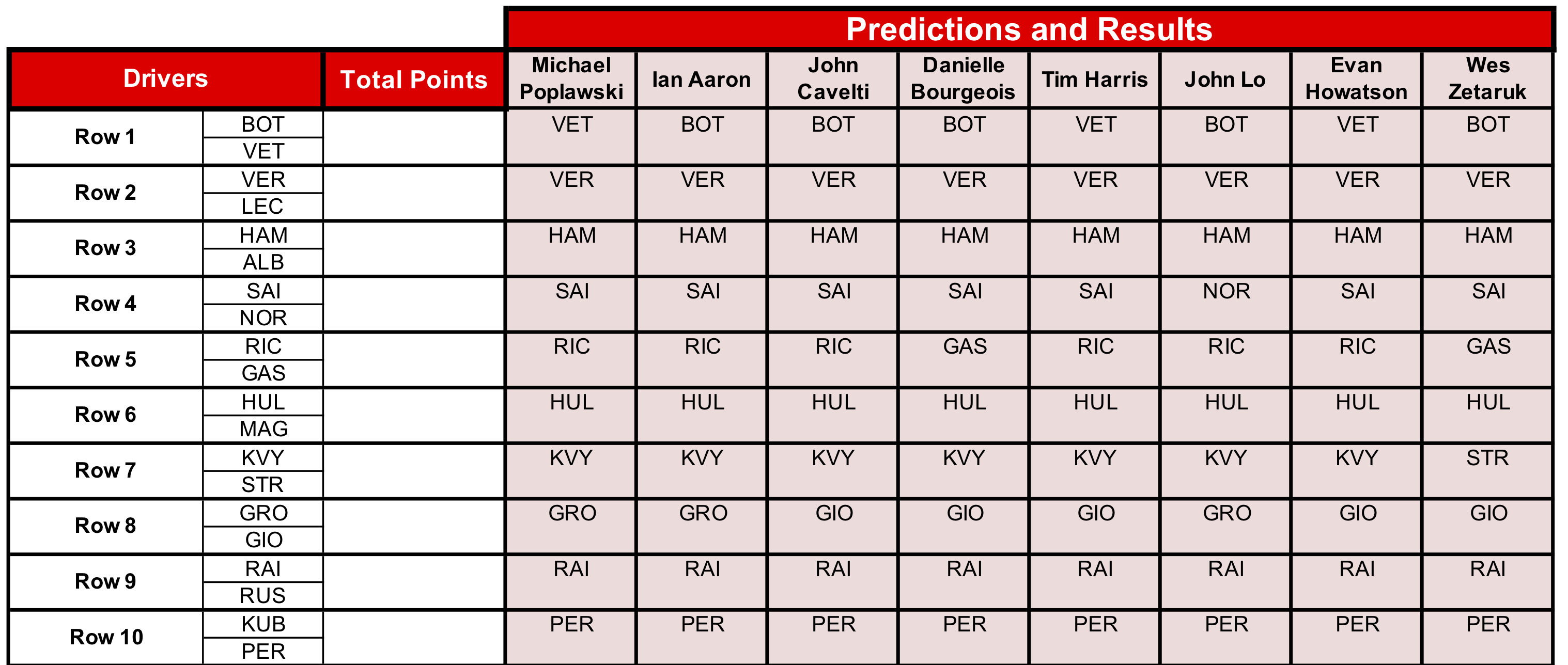 In contrast to a week ago, our predictions have followed a strong pattern and have left only five rows in play. The matchups to watch are the front row battle between Valtteri Bottas and Sebastian Vettel as they seek victory and respect within their teams and from Row 8, where Antionio Giovinazzi and Romain Grosjean look to score any kind of a result.