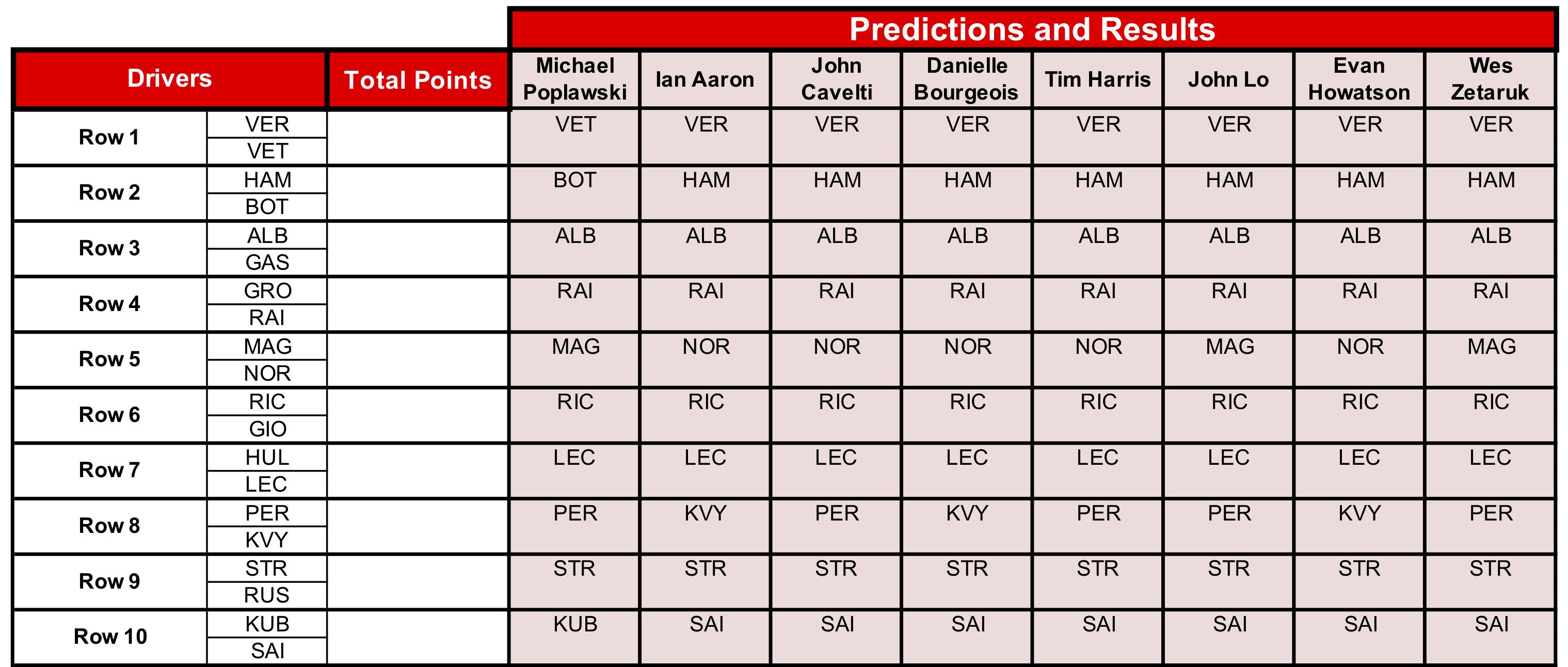 Our predictions have largely gone to form in advance of what might be an eventful race, as only five rows are in play, and three more have just one outsider being chosen. We’re mostly uncertain how Keven Magnussen will do versus Lando Norris in Row 5 as well as on the Sergio Pérez-Daniil Kvyat matchup in Row 8.