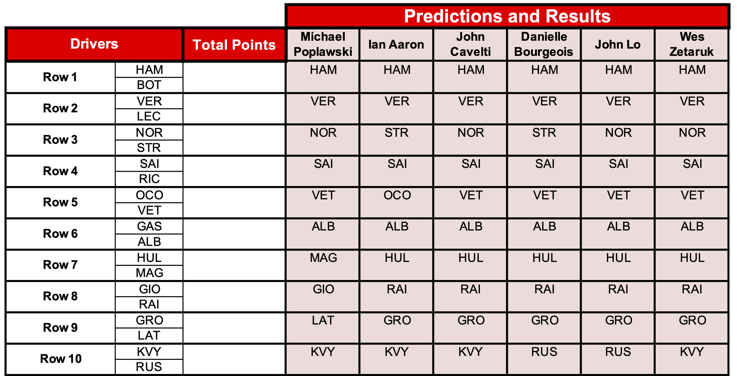 Six rows are in play with Esteban Ocon, Kevin Magnussen, Antonio Giovanazzi and Nicholas Latifi each have one player picking them this week, with Lance Stroll and George Russell also gaining support. Valtteri Bottas,. Charles Leclerc, Daniel Ricciardo and Pierre Gasly all go into the race without being chosen over their respective row-mates.