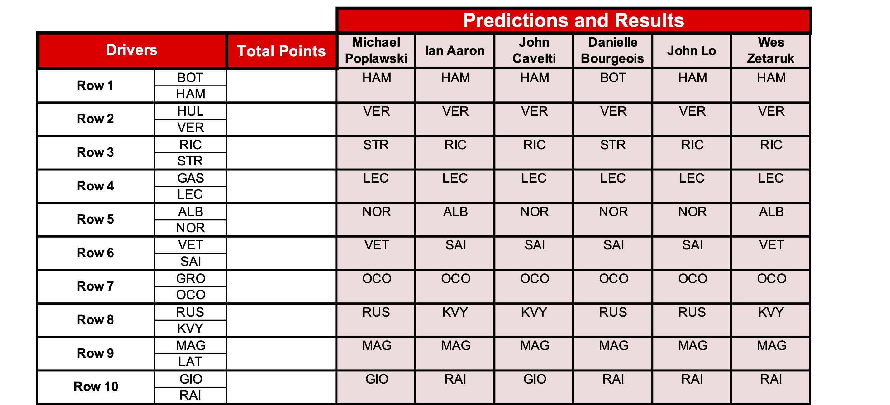 Five rows are in at least a 4-2 split amongst our players, and a sixth is also in play, for Sunday’s race! This has the potential to shake up our standings. Only surprise P3 Nico Hülkenberg, Pierre Gasly, Romain Grosjean and Nicholas Latifi didn’t make our ballots.
