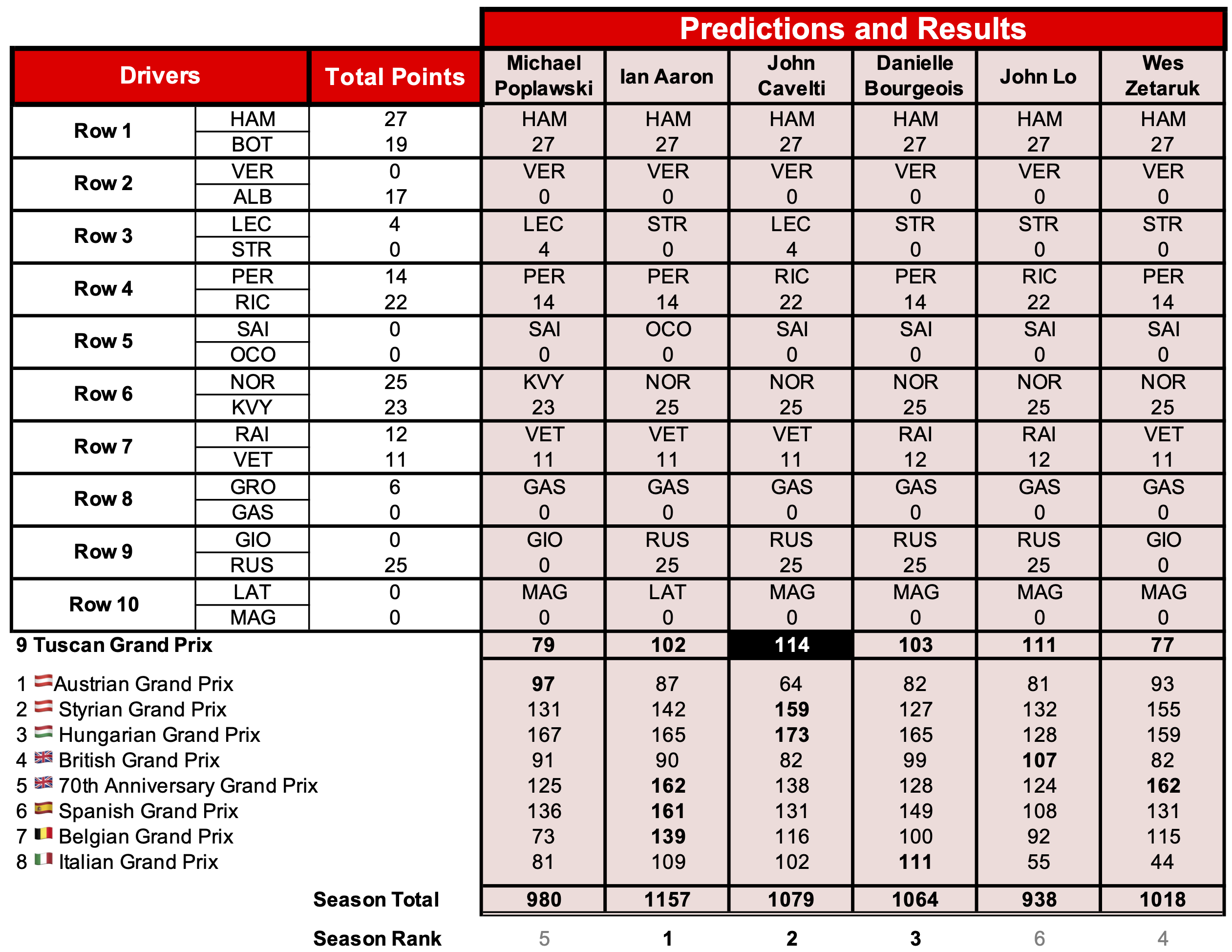John Cavelti earned top points in five of the eight scoring rows, moving him 12 points closer to Ian at the top of our standings. Danielle continues to hold down third place.
