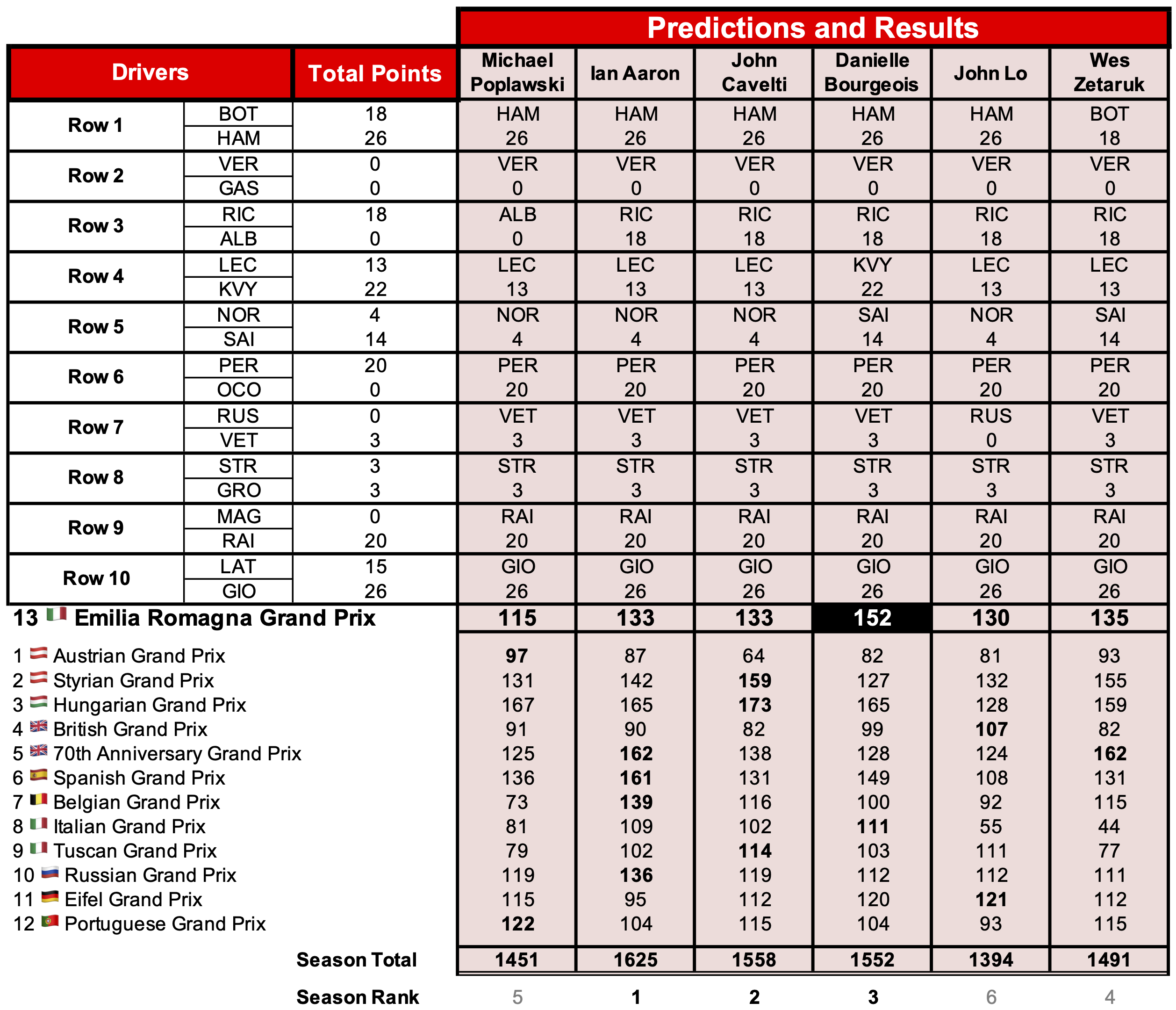 Danielle’s predictions were perfect, her 152 points representing having the top scoring driver in each of the nine scoring rows. Danielle moves into third place, while Ian continues to lead the way ahead of John Cavelti.