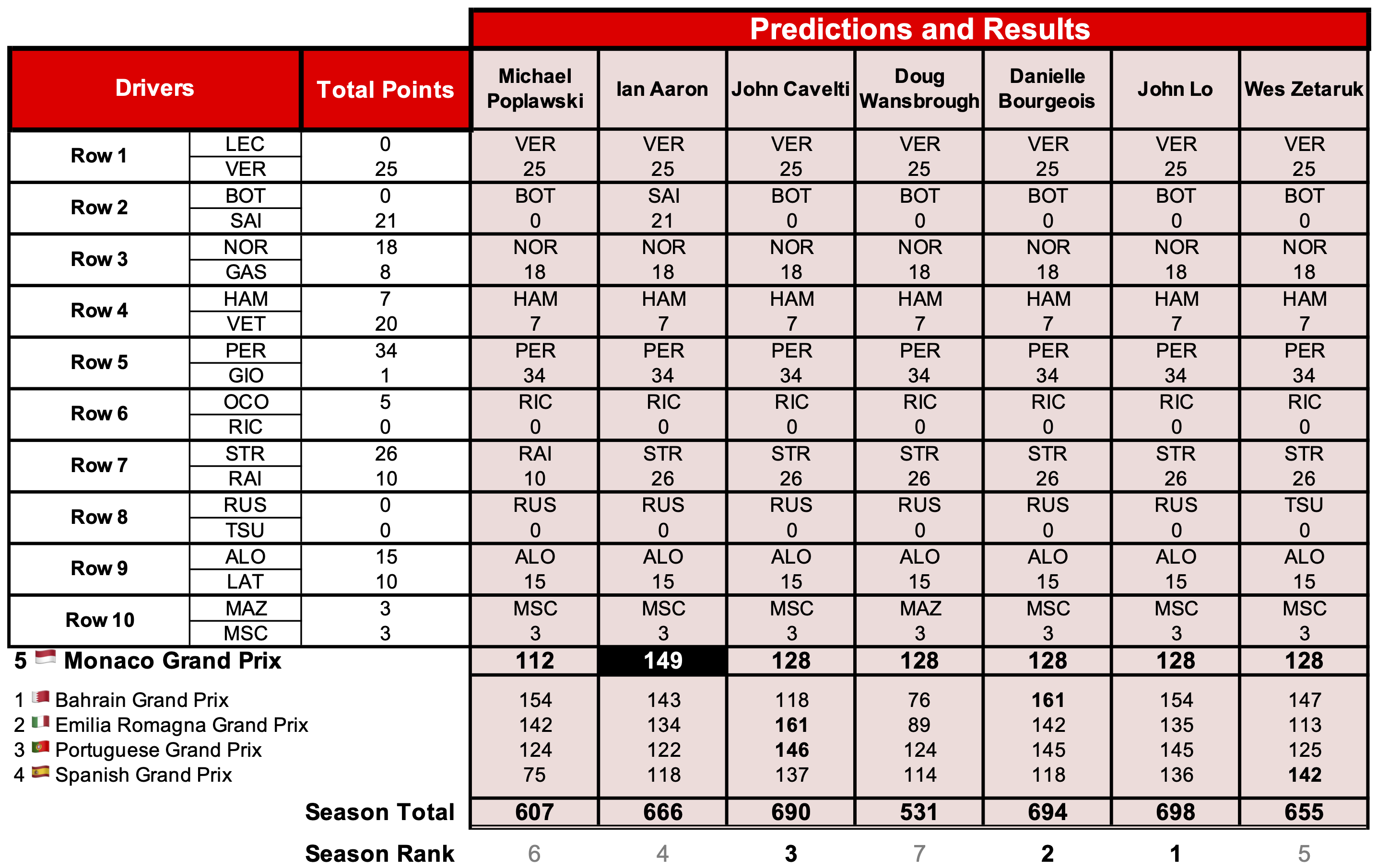 With five players earning equal points on the day, only Ian made a move forward largely thanks to his sole choice of Carlos Sainz Jr. over Valtteri Bottas, the latter’s race ending thanks to a stubborn right front tire. Michael fell further back in the standings as he missed out on Lance Stroll’s excellent day. John Lo, Danielle and John Cavelti continue to lead the way after the fifth race on the calendar.