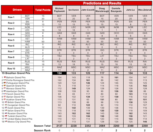 Michael waited until the 19th race of the season to earn his first top point showing, earning best points in six of the nine scoring rows. John continues to lead, while Wes has pulled level on points for the season with Danielle. (Danielle holds the first tie-breaker over Wes for podium honours, having four Grands Prix with the most points of any player to Wes’s three.) John Cavelti is just off the podium, eight points behind Danielle and Wes.