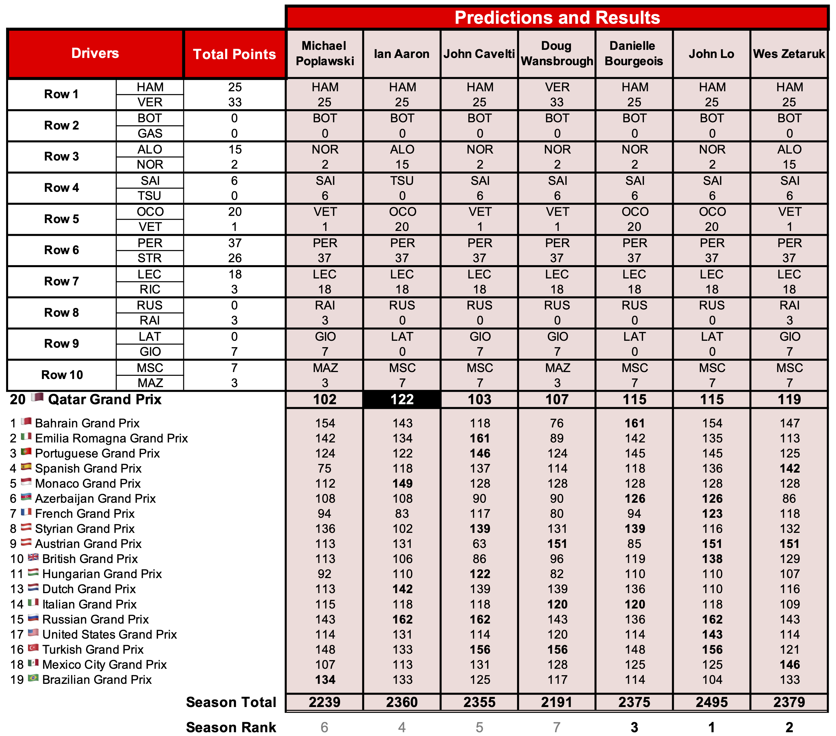 Ian’s top score (earning best points in just 5 of 9 scoring rows on what was a tricky race to predict) has helped him move into 4th place and within clear striking distance of the podium with two races still to take place. John Lo’s lead looks safe for the season, while only 24 points separate Wes in second place and John Cavelti in fifth.