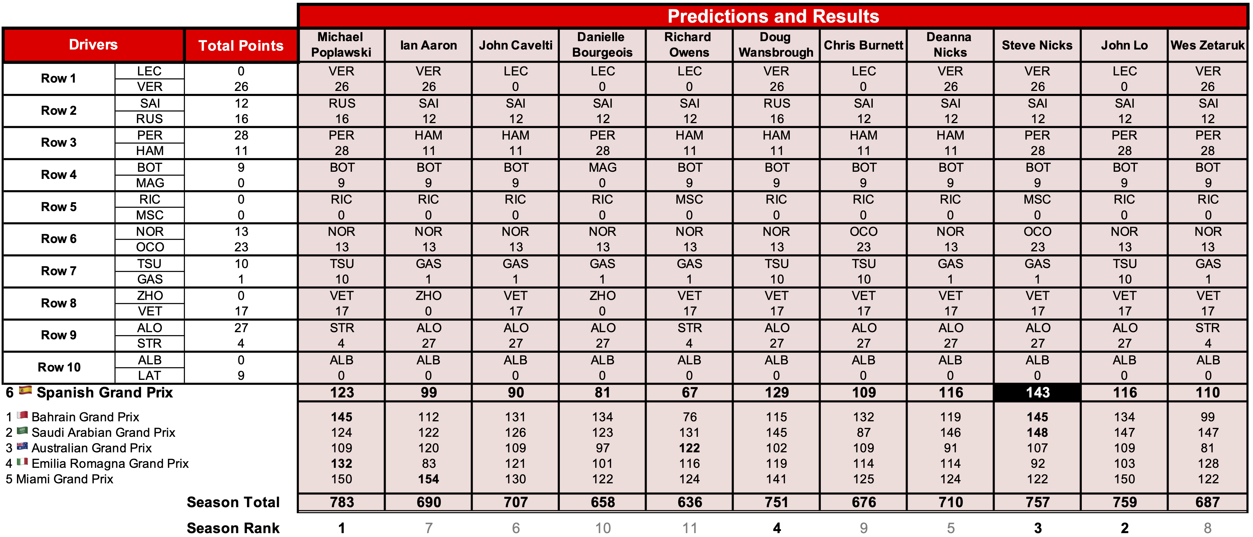 Steve was top scorer for the third time in six races, earning top marks in six of the nine scoring rows. Michael, John and Doug continued to hold their prize positions after a Spanish Grand Prix that did came through on its promise to shake up our season standings.