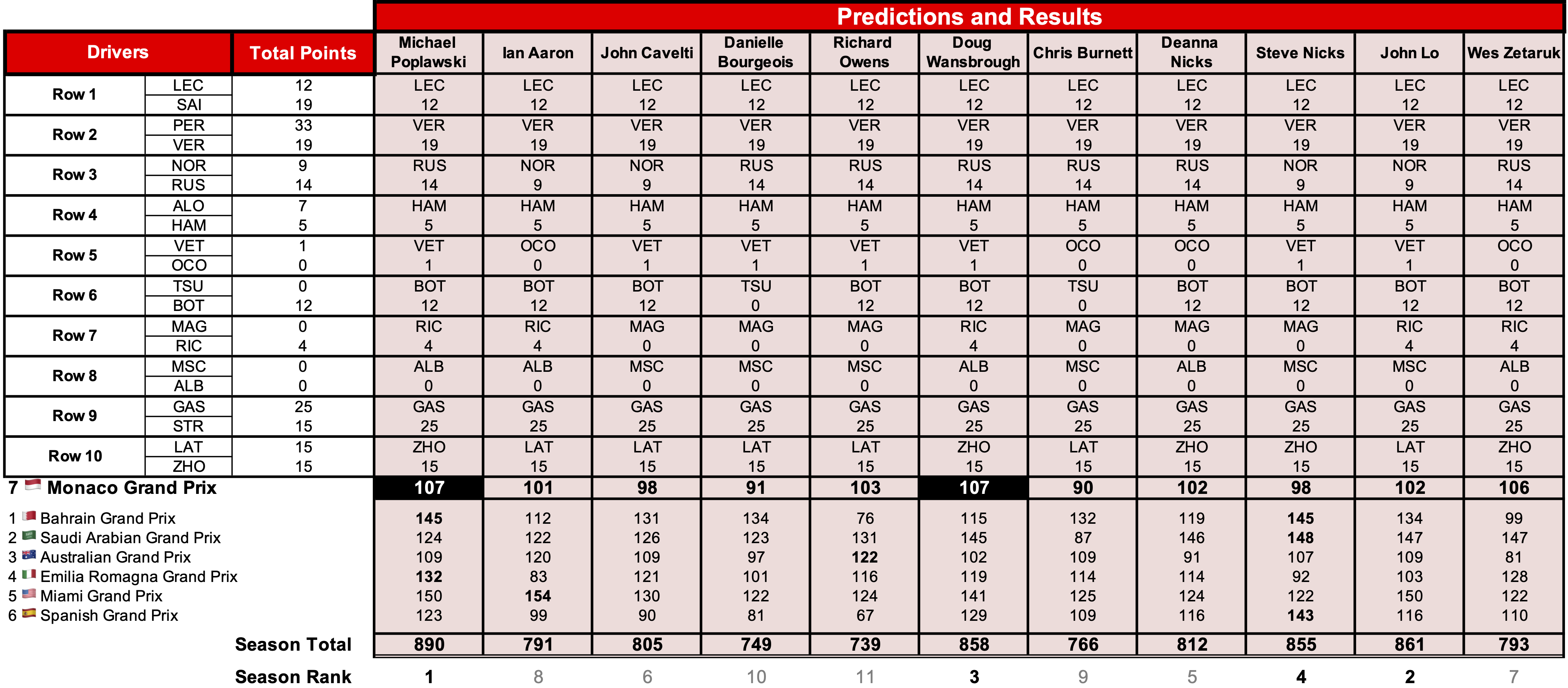 Doug earned top marks for the first time this season, matching Michael on the day, and moved up into third place for the season. John Lo continues to hold second place behind Michael, while Steve continues in fourth with a cushion over Deanna.
