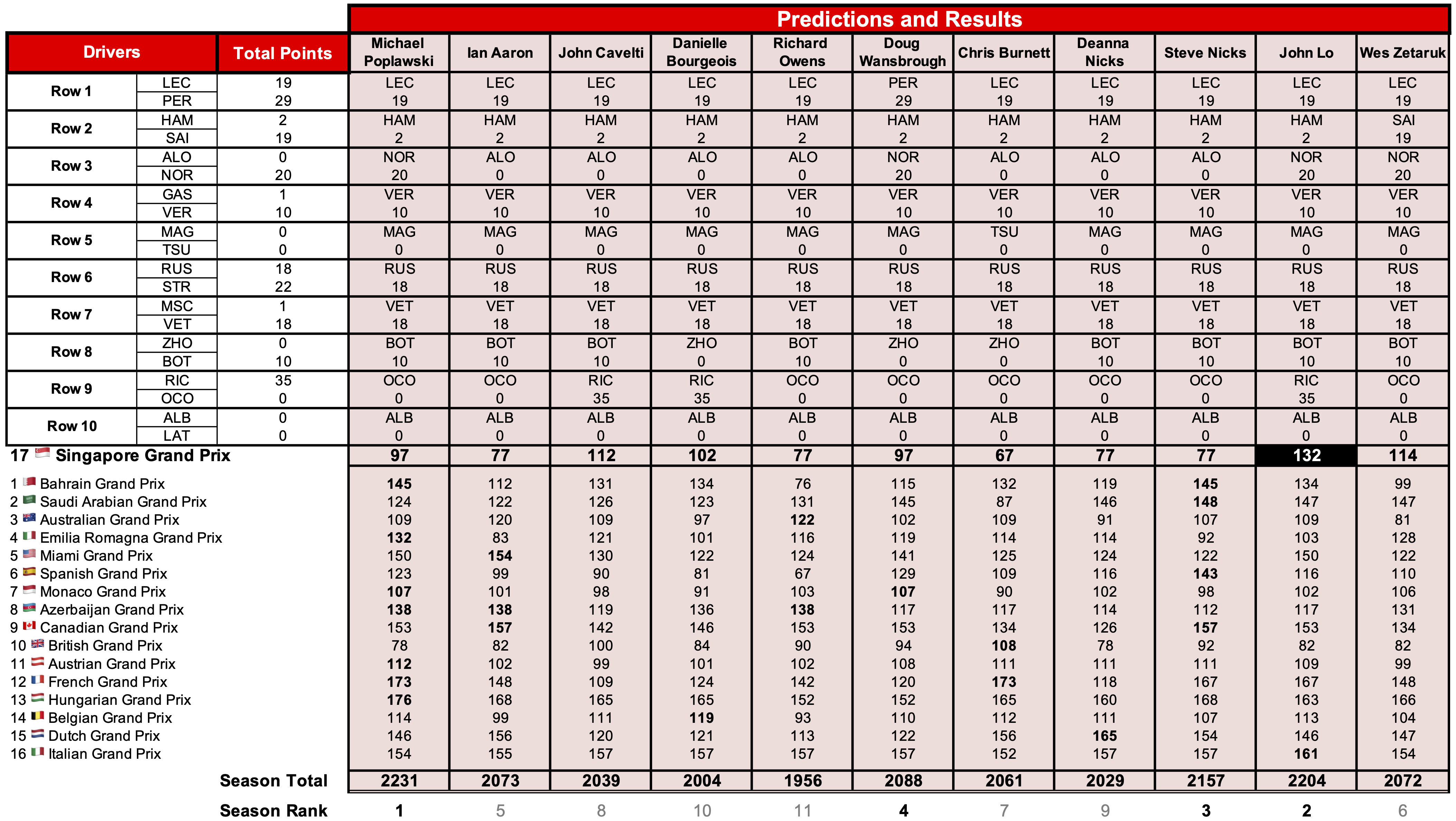 John Lo’s earned our top score once again, moving him into second place in our season standings. A tricky day to predict (John only had best score in five of the eight scoring rows correct) also led to Doug sneaking into the fourth prize spot once again.