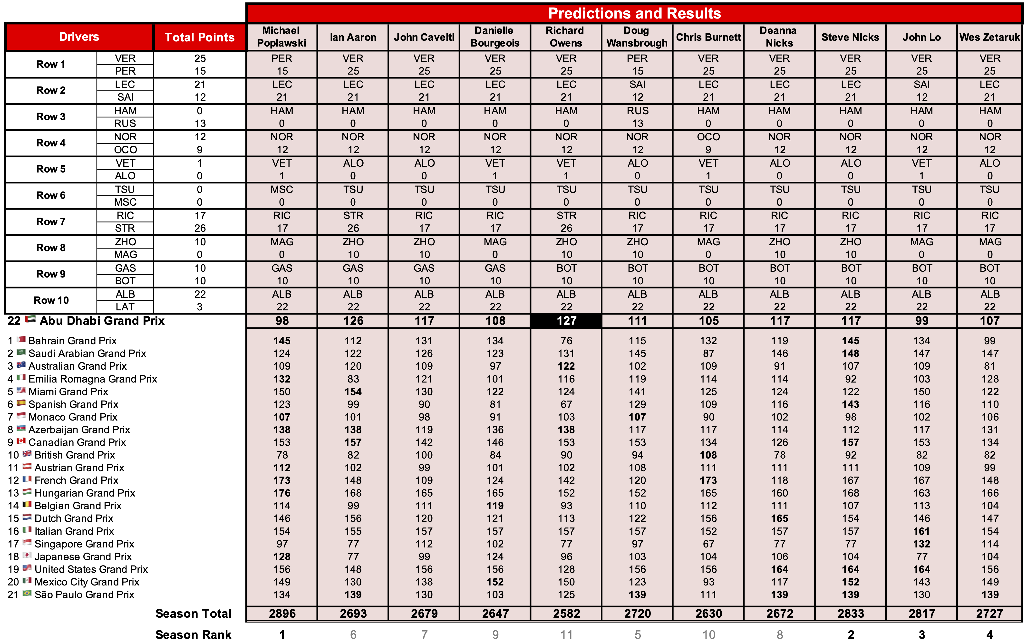 Congratulations are due our four prize winners! Michael is the Formula 1 Prediction Challenge champion for the second time. Steve’s strong showing in the final race pushed him past John Lo for second place, while Wes held off Doug for the fourth and final spot.