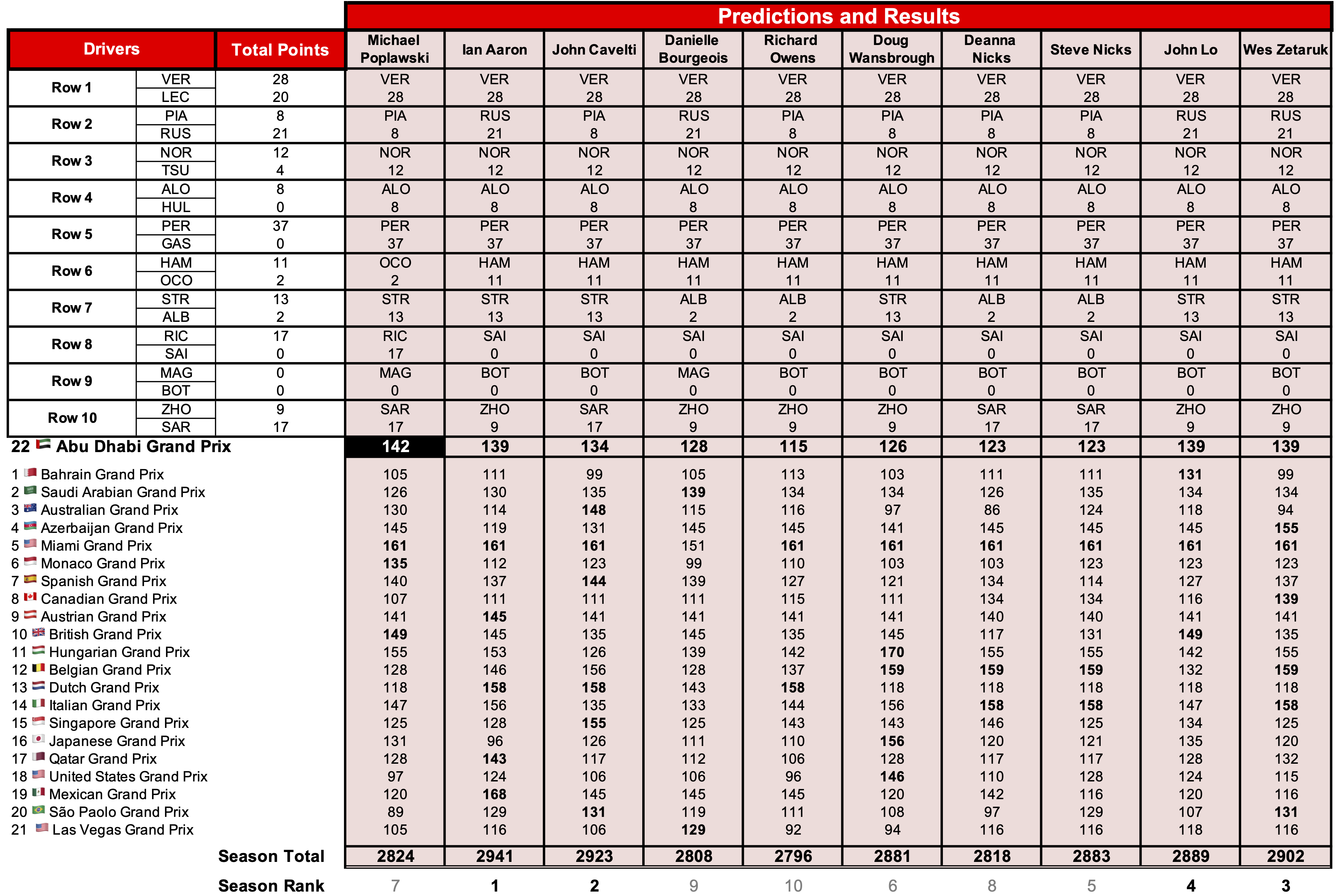 Ian survived the tight season-long race to win his second Formula 1 Prediction Challenge! and a fifth prize finish in the six years of this game’s existence. John Cavelti finished 18 points back and earned his third prize finish. Wes and John Lo round out our prize spots just ahead of Steve and Doug who narrowly missed out on prizes.