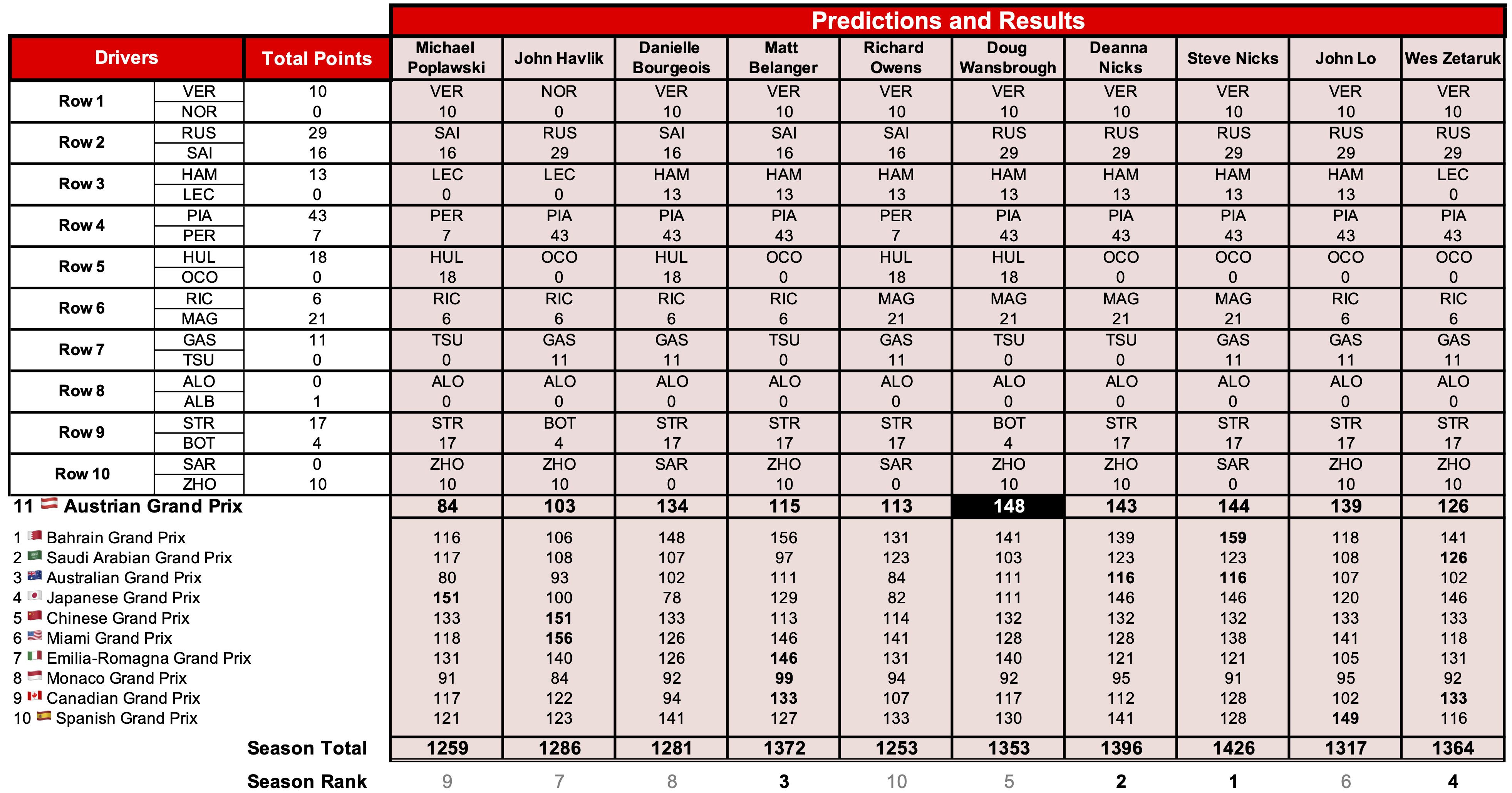 Doug was the top player for the first time this season, predicting the better driver in seven of ten scoring rows. Doug has closed his gap from the prize spots to a mere 11 points; Steve, Deanna, Matt and Wes continue to occupy the top of our table.