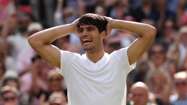Carlos Alcaraz defeated Novak Djokovic 6-2, 6-2, 7-6 (4) in the Wimbledon men’s final Sunday to collect his fourth Grand Slam title at age 21.