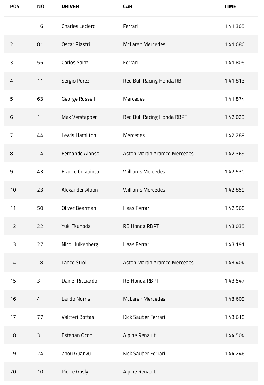 Azerbaijan Grand Prix Starting Grid from formula1.com as at 11:42 PDT Saturday