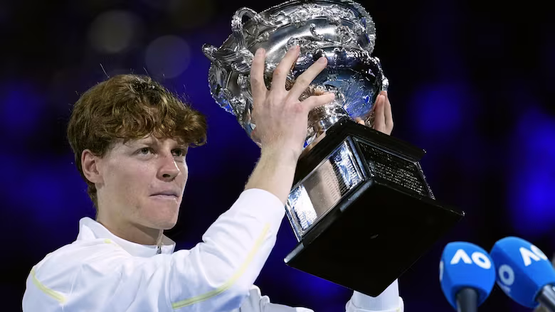 Italian tennis star Jannik Sinner hoists the Norman Brookes Challenge Cup after defeating Germany’s Alexander Zverev in the men’s singles final at the Australian Open on Sunday in Melbourne, Australia. (Ng Han Guan/The Associated Press)