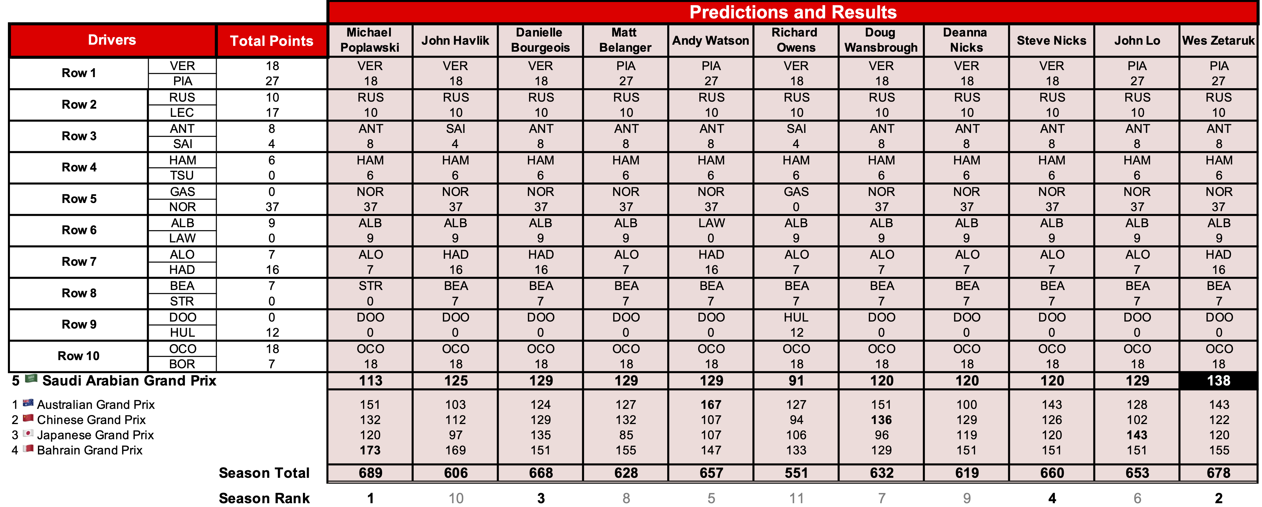 Wes was top predictor with eight rows correct, moving him up to second behind Michael in the standings through the fifth race of the season. Danielle moves up to third place while Steve drops into fourth spot.
