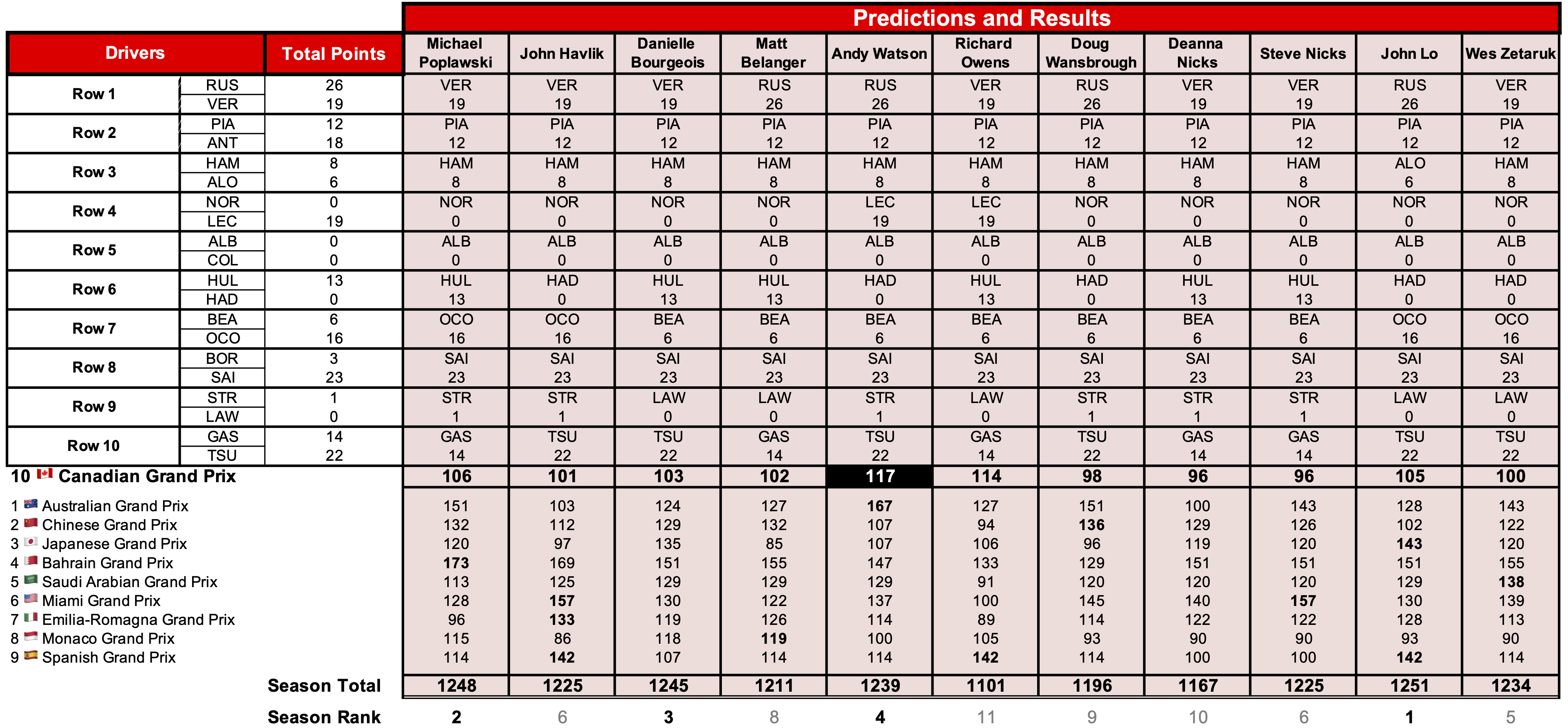 Andy was top predictor for the first time since the Australian Grand Prix to open our season, with five of the nine scoring rows correct. Andy moves up three places overall to fourth, while John Lo is our new leader. Michael and Danielle continue to occupy second and third place