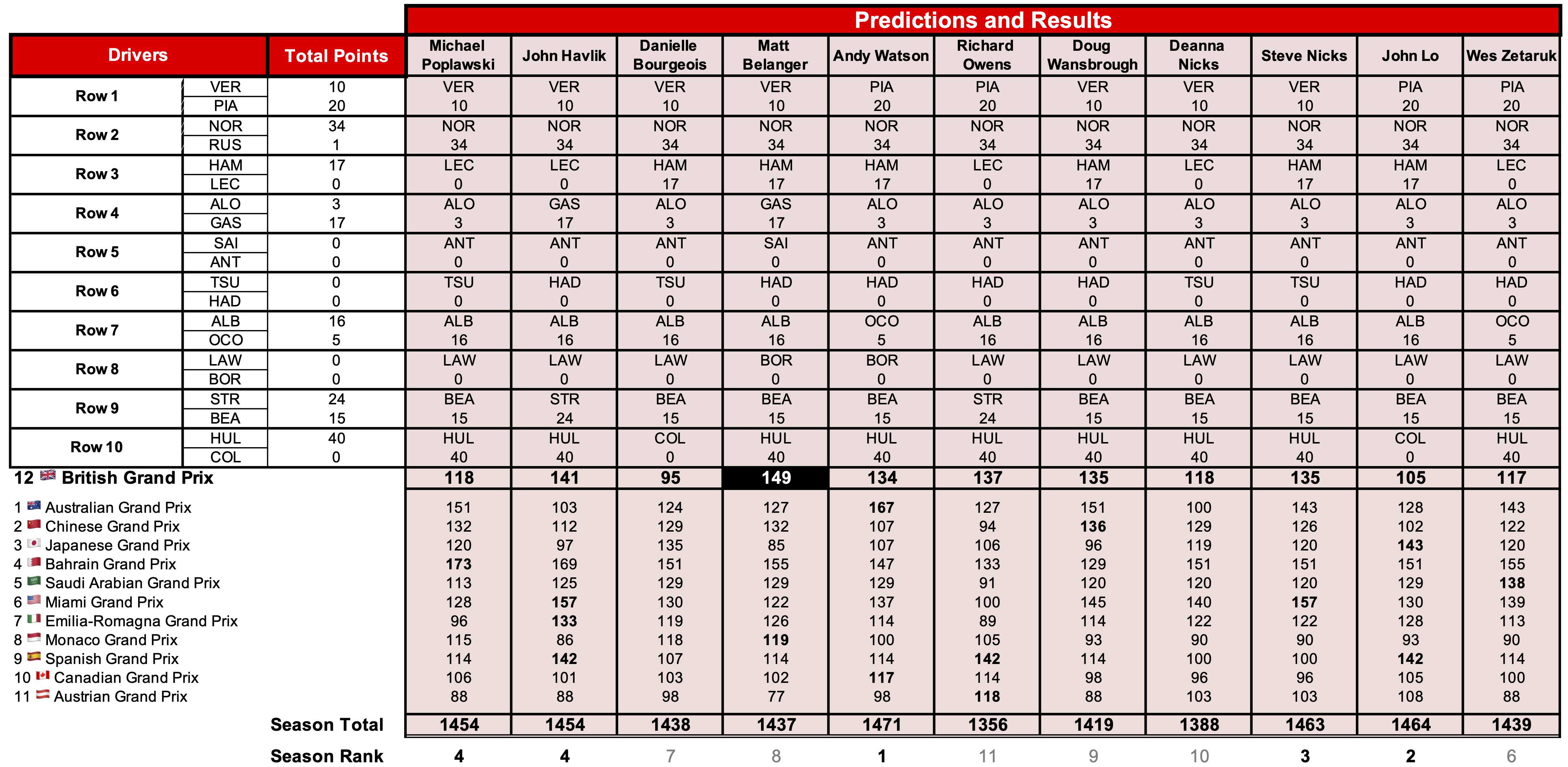 Matt was best predictor for the second time this season, having five of the seven scoring rows correct, and 149 of a possible 168 points. Andy is our new leader, while John Lo drops to second place. Steve moved back into third place ahead of Michael to round out the prize spots.
