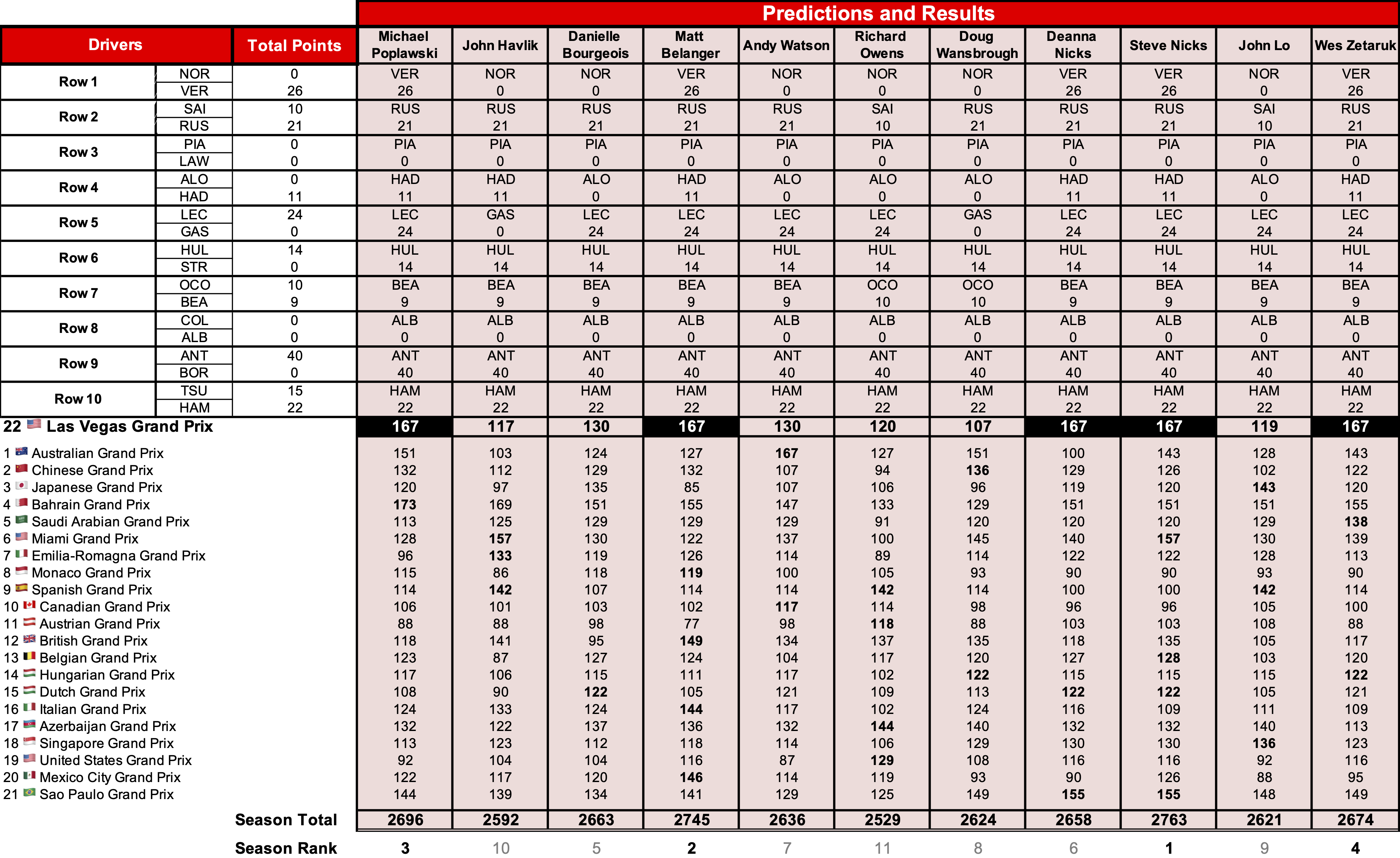 No fewer than five players (Deanna, Matt, Michael, Steve and Wes) earned top marks on the day, missing a perfect score by only the one point earned by Esteban Ocon over Oliver Bearman. Steve continues to lead the overall standings by 18 points over Matt with two Grands Prix remaining on the schedule. Michael and Wes have moved up into third and fourth place, respectively, at the expense of Danielle, who is 11 points back of a prize spot, while Deanna has moved within 16 points of the prizes.