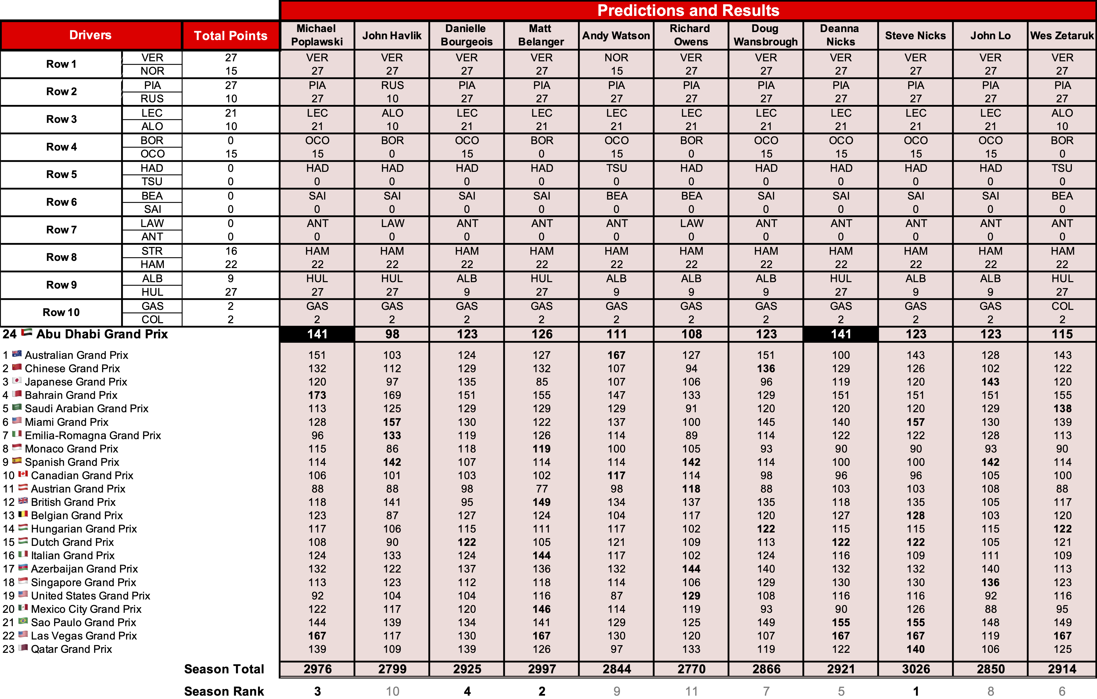 Deanna and Michael were top predictors in the final Grand Prix of the 2025 season having the top driver in all seven scoring rows correct.